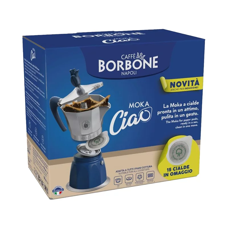 Scopri la nuova MOKACIAO Caffè Borbone, da oggi puoi utilizzarla sia su fornelli a gas che a induzione. Prepara fino a 3 caffè con una sola cialda! Scegli di gustare il caffè che preferisci, seguendo il dosaggio dell'acqua, con i pratici segni riportati all'interno della caldaia. Con 15 cialde miscela blu OMAGGIO.